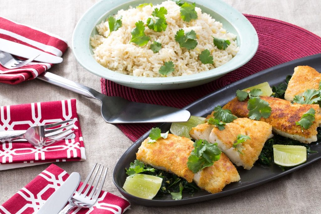 Cod cu crustă de migdale, nucă de cocos și spanac cu ghimbir