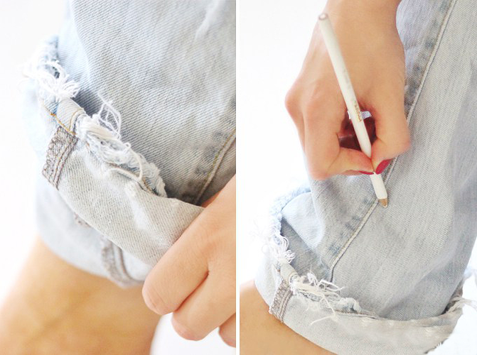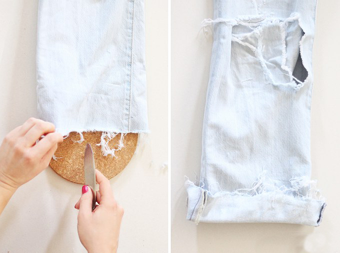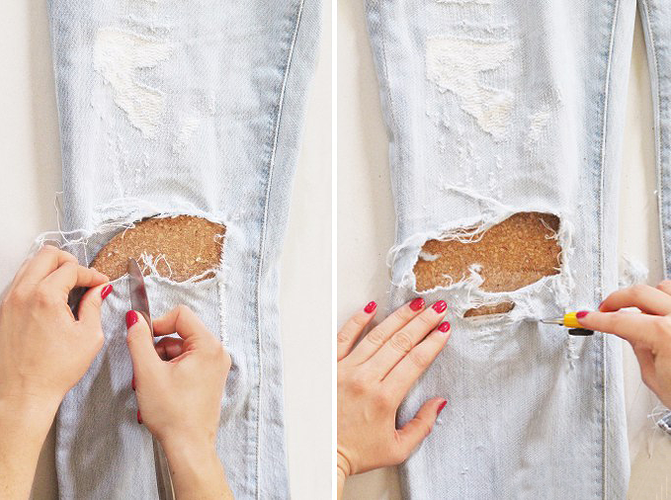 Destrămați partea de jos a tivului cu un cuțit pentru unt. Folosiți cercurile de plută pentru a le pune înăuntrul blugilor, petru a proteja suprafața de dedesubt.
