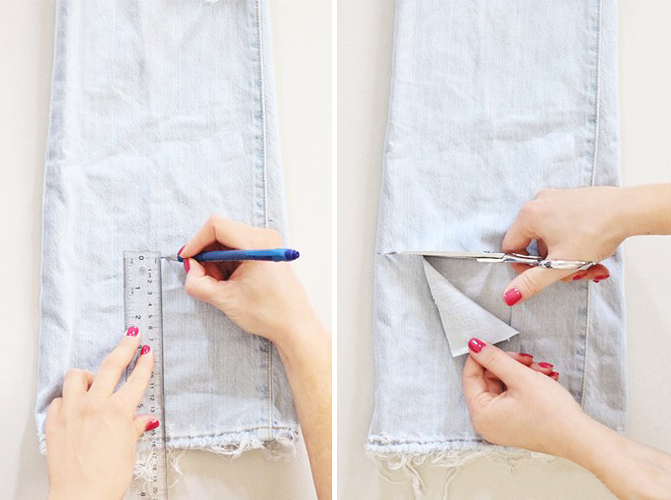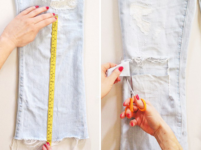 Probați jeanșii din nou ca să vedeți exact unde vor veni genunchii și unde îi veți deastrăma. Înainte să tăiați, măsurați încă o dată pentru a vă asigura că va orice veți face pe partea stângă să se repete și pe dreapta. Puteți decupa într-un dreptunghi ca să vă fie mai ușor.