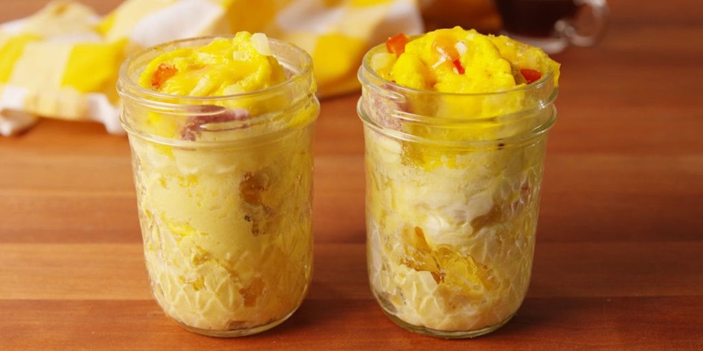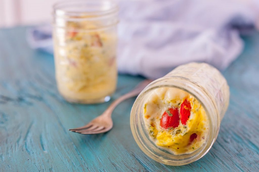 Apoi se face omleta şi se adaugă şi ea în borcan. Se pune baconul. Se mai poate presăra ceapă verde deasupra. Bineînțeles, în funcție de gusturile avute, puteți face orice combinație doriți! 🙂