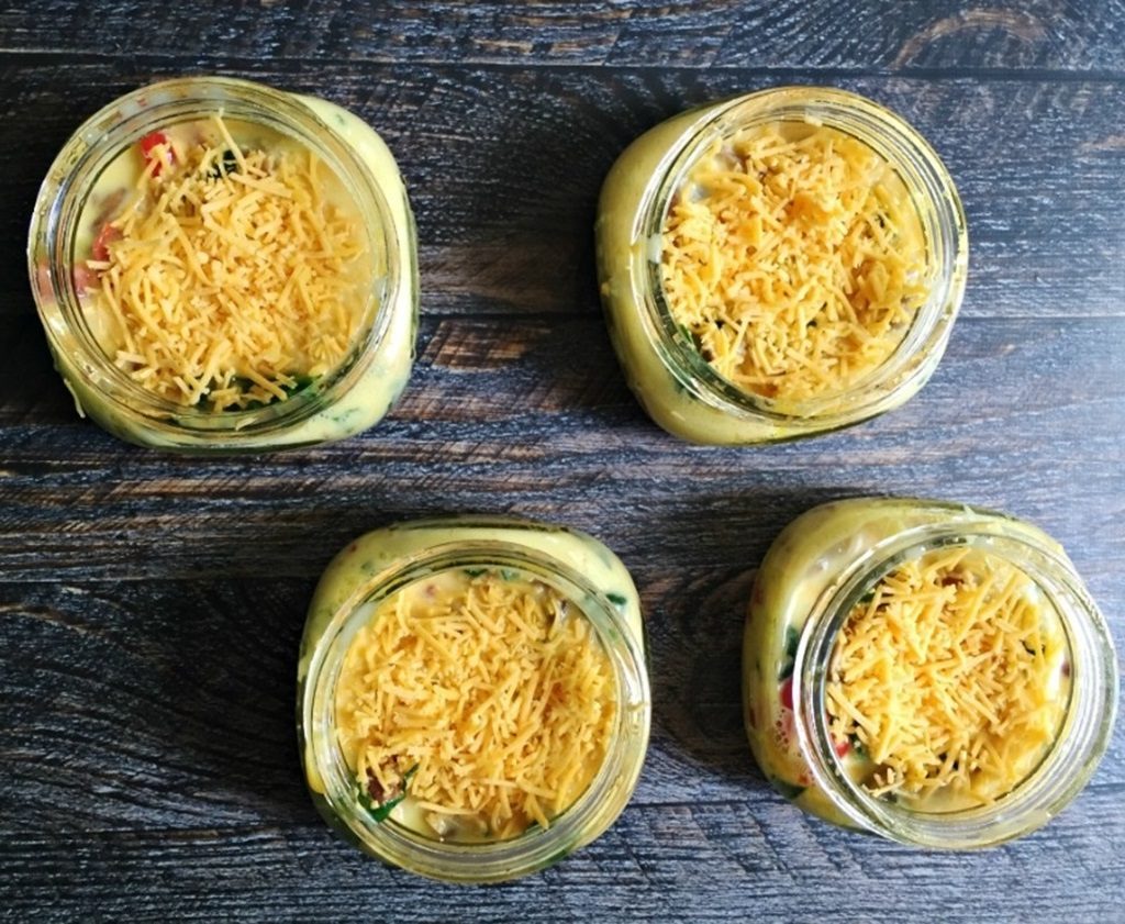 Baconul se pune în tigaie şi se lasă 2-3 minute pe fiecare parte, până devine crocant. Spanacul, ceapa verde tocată mărunt şi brânza se pun într-un borcan de 300 g.