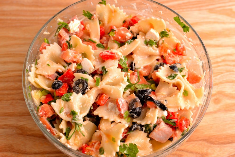 Se pun pastele intr-un castron, se adauga celelalte ingrediente tocate, se presara dressingul preparat si se amesteca foarte usor ca sa nu se sfarame pastele.