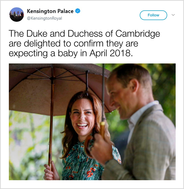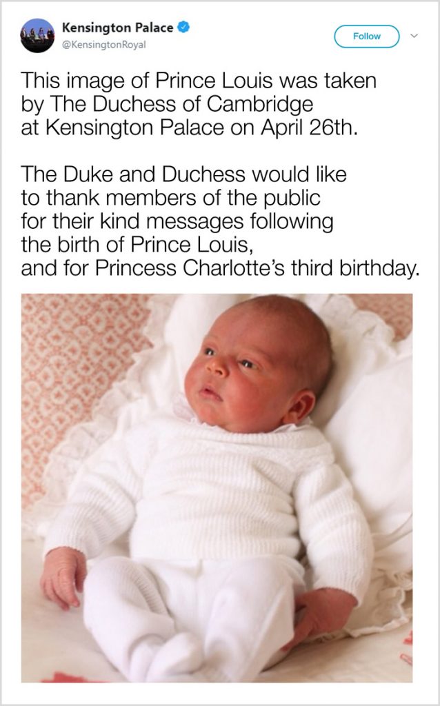 Kate Middleton nu poate publica fotografii deoarece nu îi este permis să aibă conturi personale pe reţelele sociale. Este permisă postarea unei fotografii a copilului pe contul oficial de Twitter al familiei regale.
