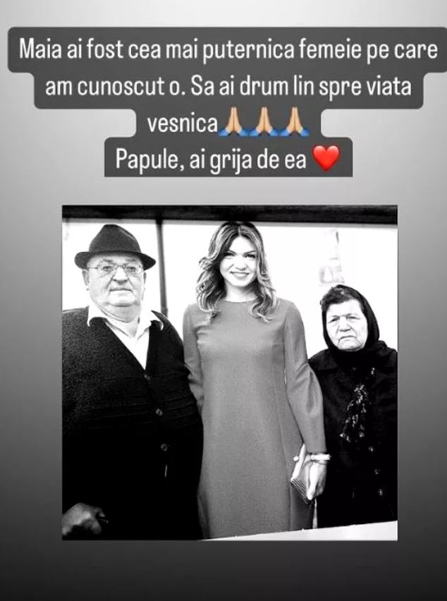 “Maia, ai fost cea mai puternică femeie pe care am cunoscut-o. Să ai drum lin spre viață veșnică! Papule, ai grijă de ea!”, a scris Simona pe Instastory, unde a postat o fotografie cu bunicii ei.